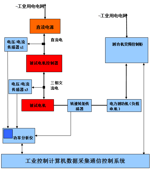 • 電力測功機; • 計算機測量控制系統; • 轉速扭矩傳感器; • 電流電壓傳感器; • 鑄鐵平臺; • 測功機變頻控制柜; • 彈性聯軸器; • 被測電機安裝支架。
