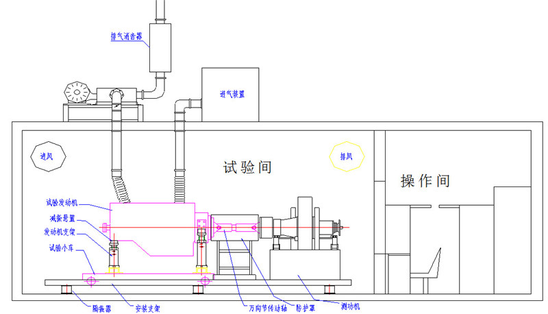室外排氣管由排煙風機(8000m³/h 1200Pa)、排氣消聲器、排氣管、保溫絕熱材料等組成。室外排氣管路與試驗室頂部的固定連接采用隔震連接,排氣管和消聲器之間安裝專用支座,以便于消聲器的拆卸、清理和更換。排煙管外面作絕熱處理。排煙消聲器采用微穿孔板圓環式消聲器,滿足噪聲隔離要求,消聲器采用減振安裝,以減弱振動產生的固體噪聲的傳遞。消聲器不低于匹配功率為400kw發動機的消聲要求。排煙消聲器消聲量≥40 dB(A) 排煙系統噪聲≤80dB(A) 排煙口徑:≥100DN 排煙管路采用不銹鋼管。